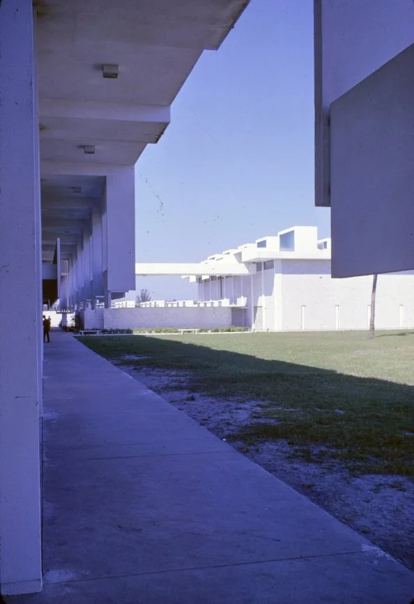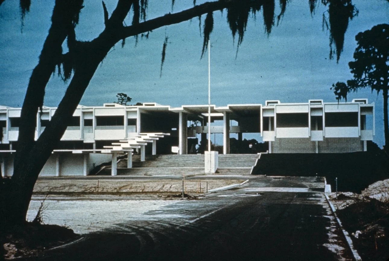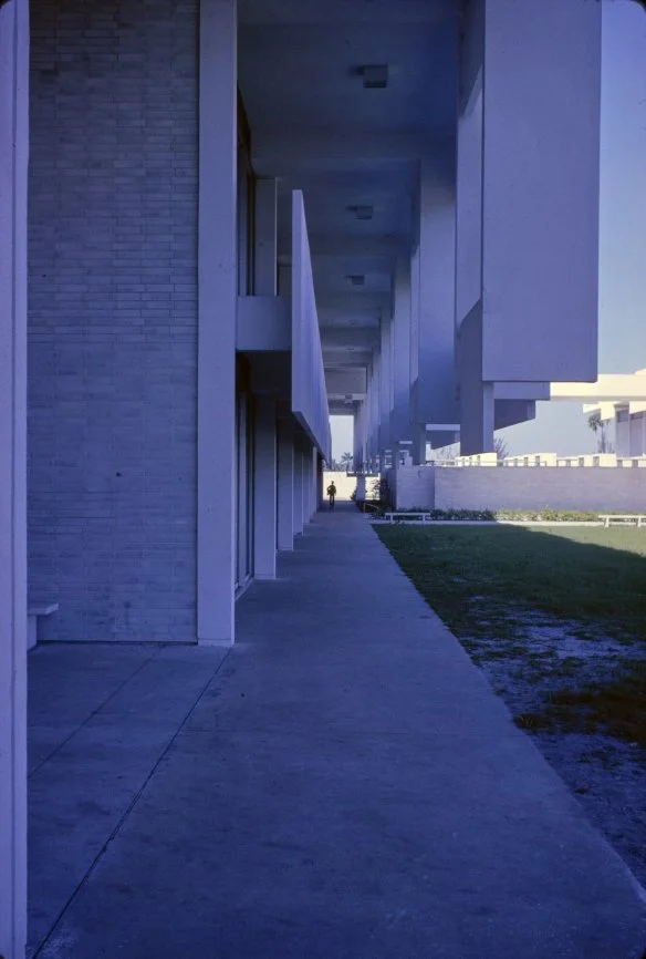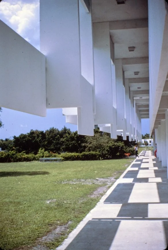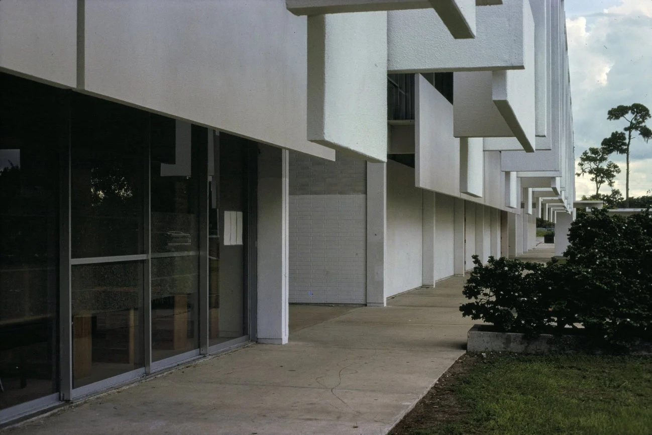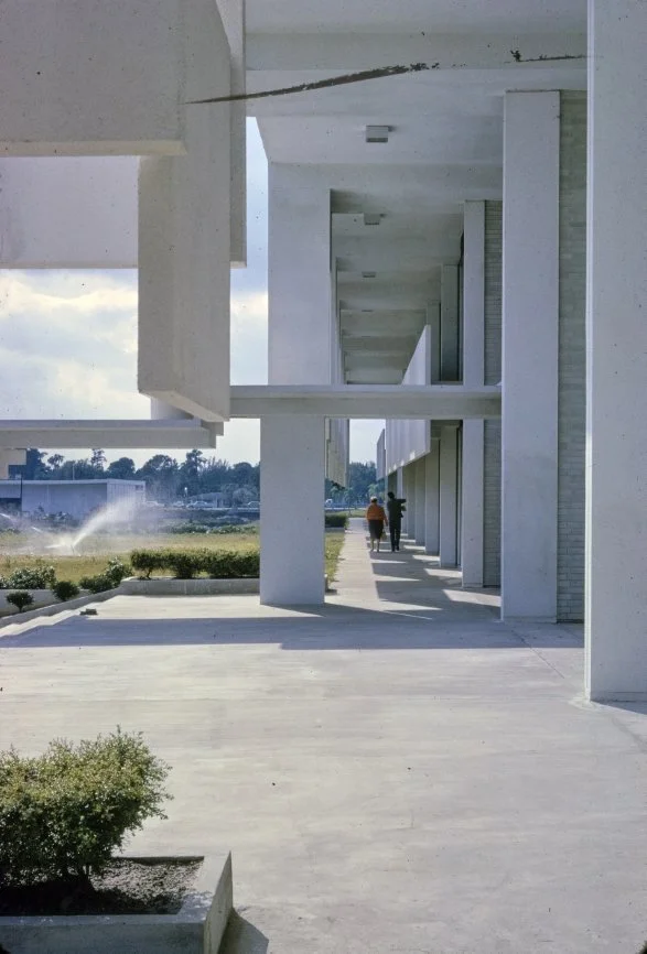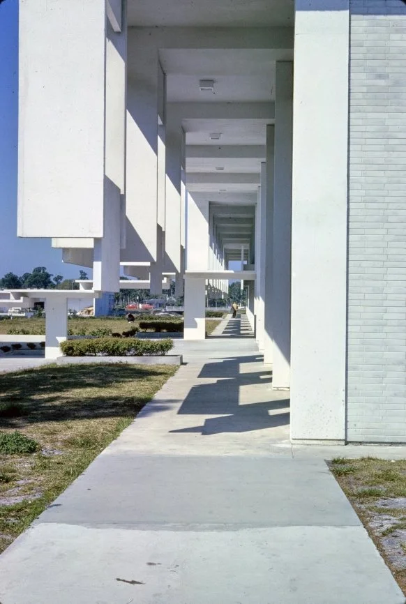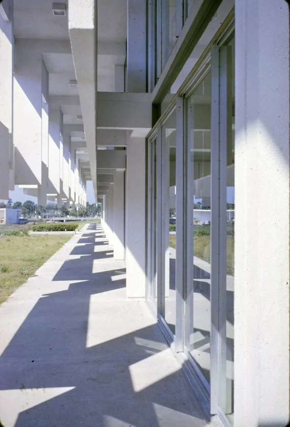 “This building is intended to suggest the uniqueness of the Florida climate through carefully arranged sun shields and interior ventilating and lighting scopes. Its concrete structural frame is bent in such a way as to create hollow boxes at every bay, thereby accommodating an integral mechanical system. Planes in space which allow the building to be understood from great distances are utilized rather than the linear organizations of earlier buildings. The open-ended aspect of the building allows it to grow: thuse the notion that no building is ever fixed and complete within itself is made clear. ”