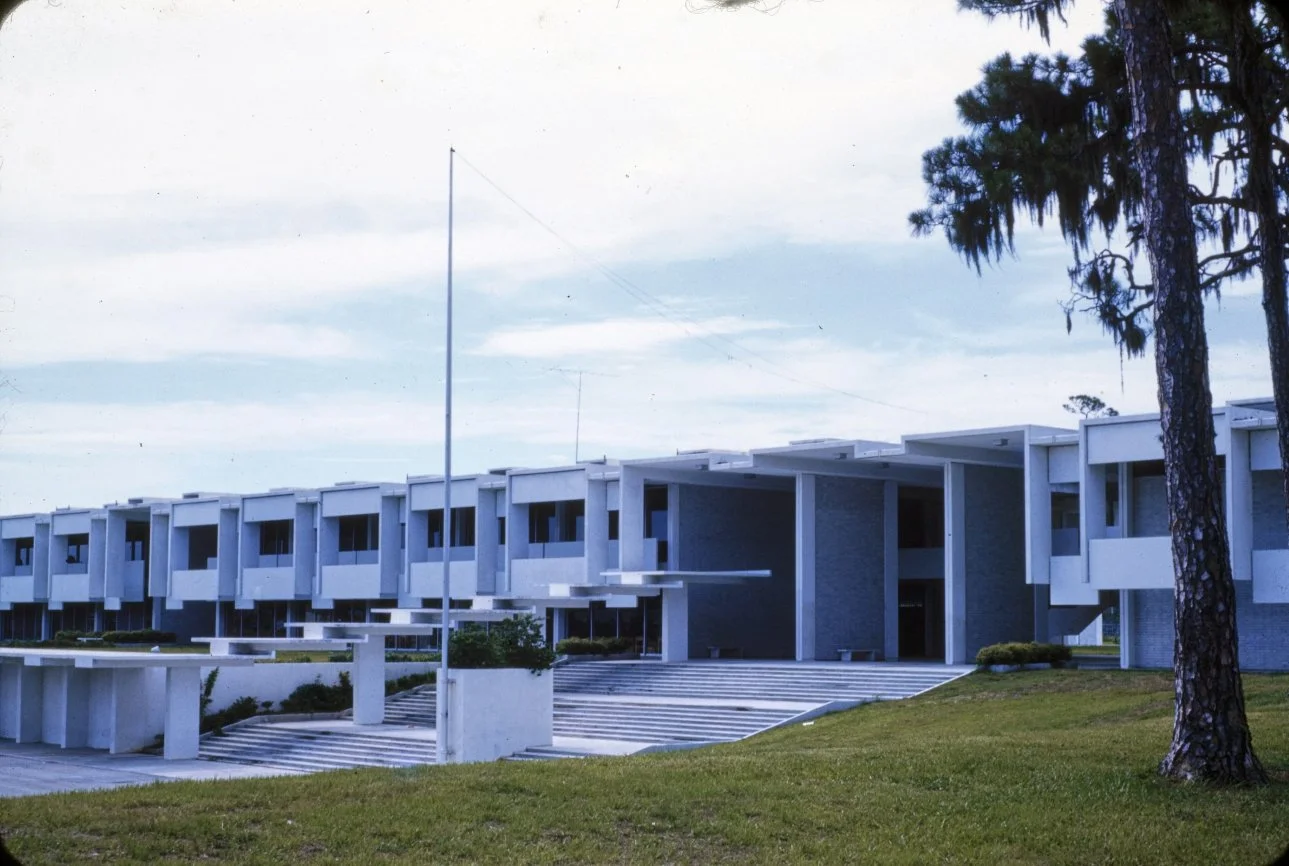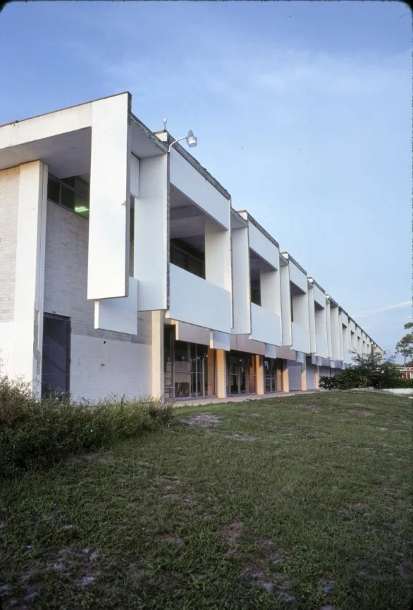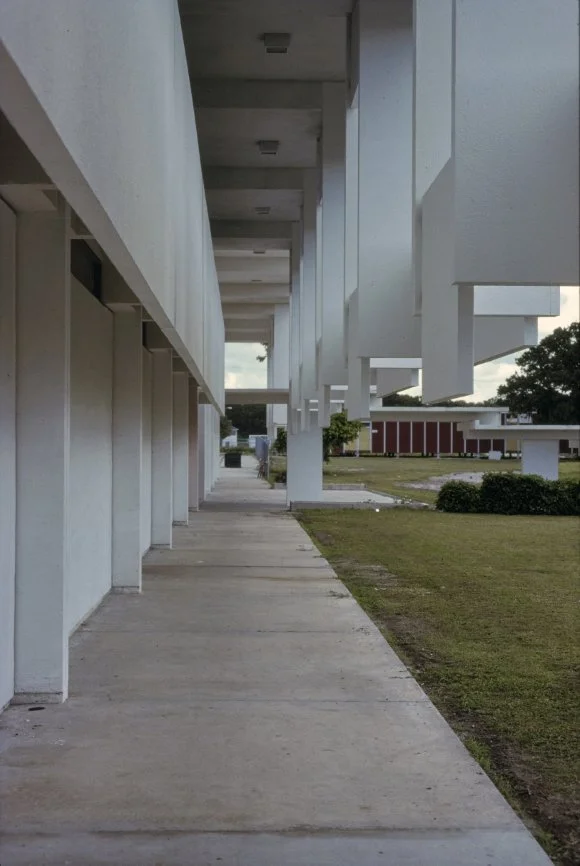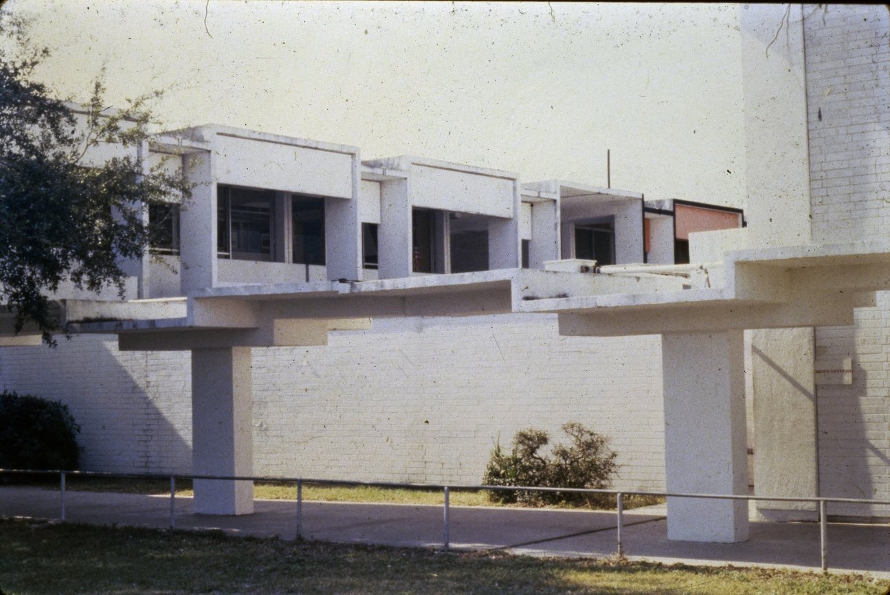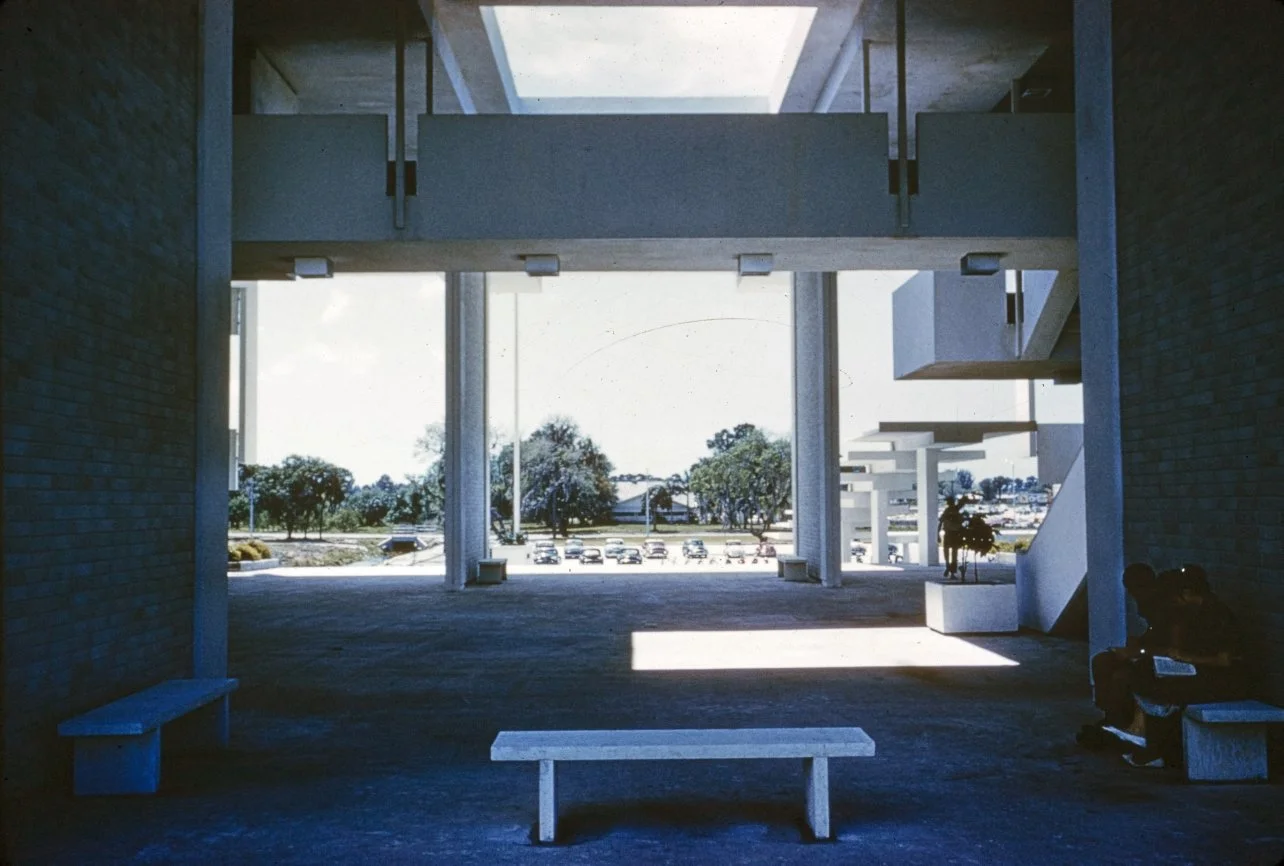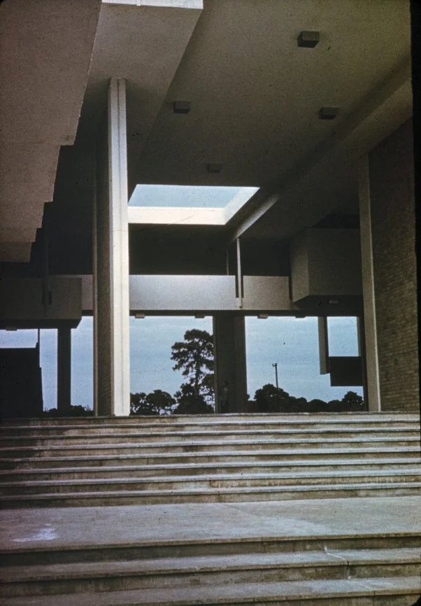 “This building is intended to suggest the uniqueness of the Florida climate through carefully arranged sun shields and interior ventilating and lighting scopes. Its concrete structural frame is bent in such a way as to create hollow boxes at every bay, thereby accommodating an integral mechanical system. Planes in space which allow the building to be understood from great distances are utilized rather than the linear organizations of earlier buildings. The open-ended aspect of the building allows it to grow: thuse the notion that no building is ever fixed and complete within itself is made clear. ”
