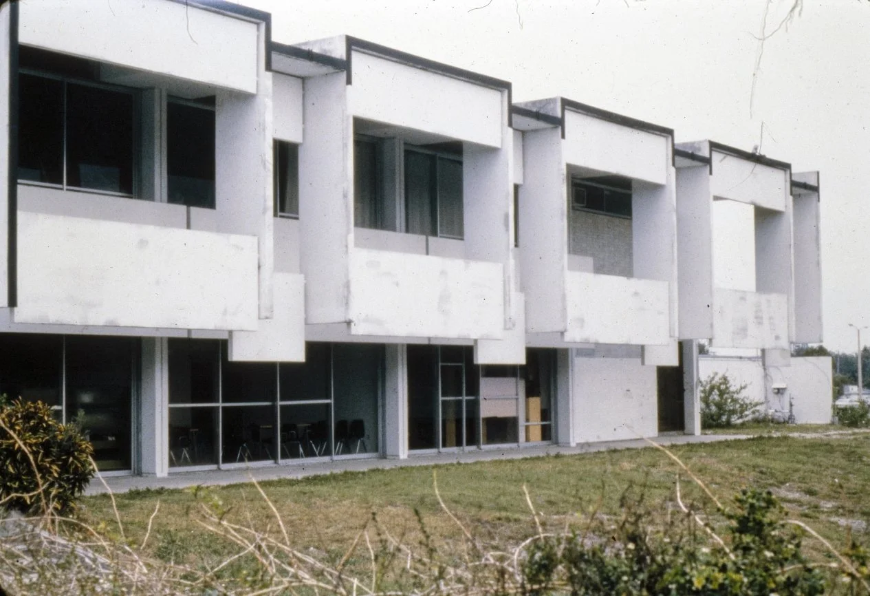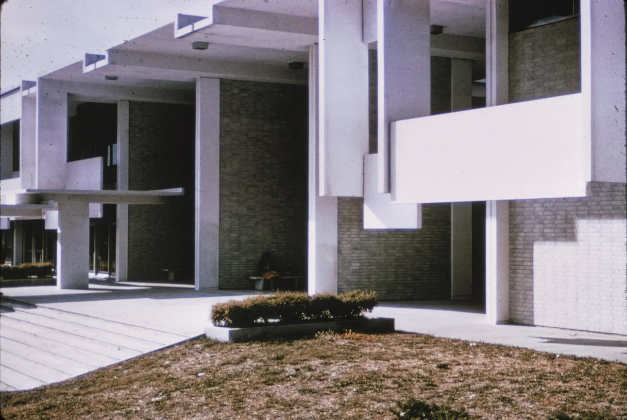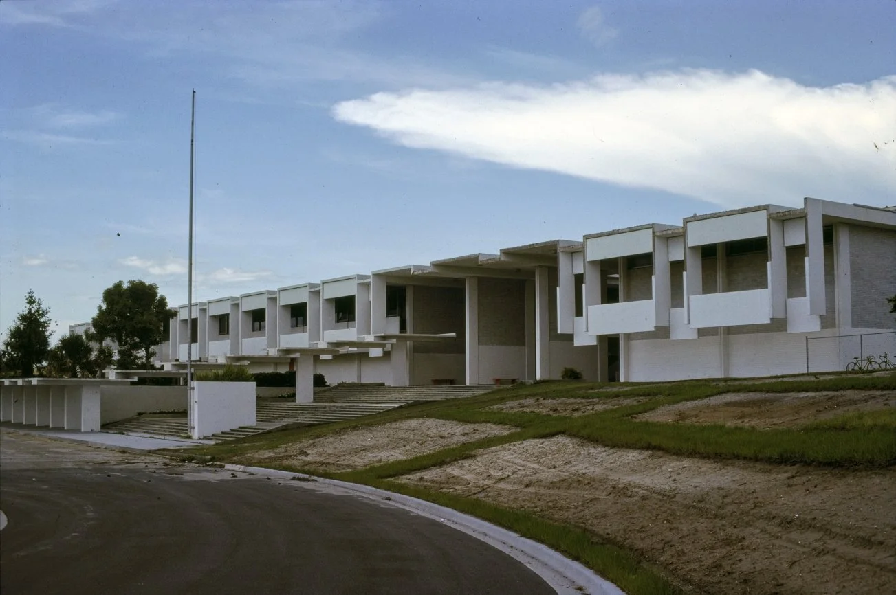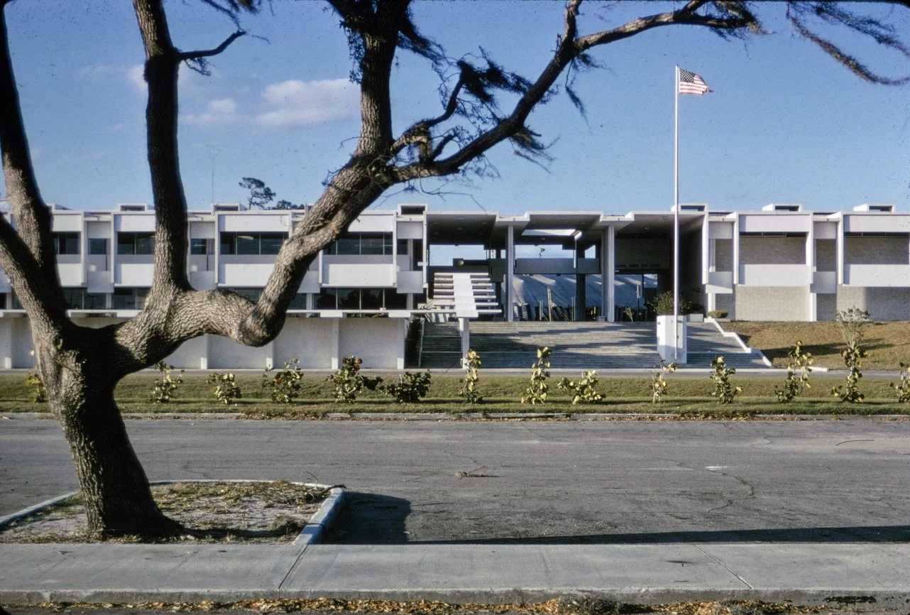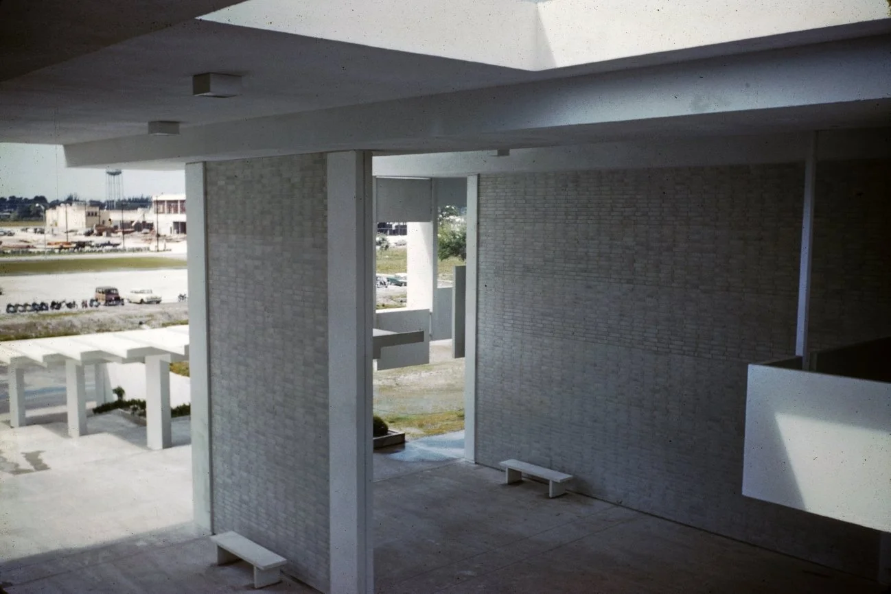 “This building is intended to suggest the uniqueness of the Florida climate through carefully arranged sun shields and interior ventilating and lighting scopes. Its concrete structural frame is bent in such a way as to create hollow boxes at every bay, thereby accommodating an integral mechanical system. Planes in space which allow the building to be understood from great distances are utilized rather than the linear organizations of earlier buildings. The open-ended aspect of the building allows it to grow: thuse the notion that no building is ever fixed and complete within itself is made clear. ”