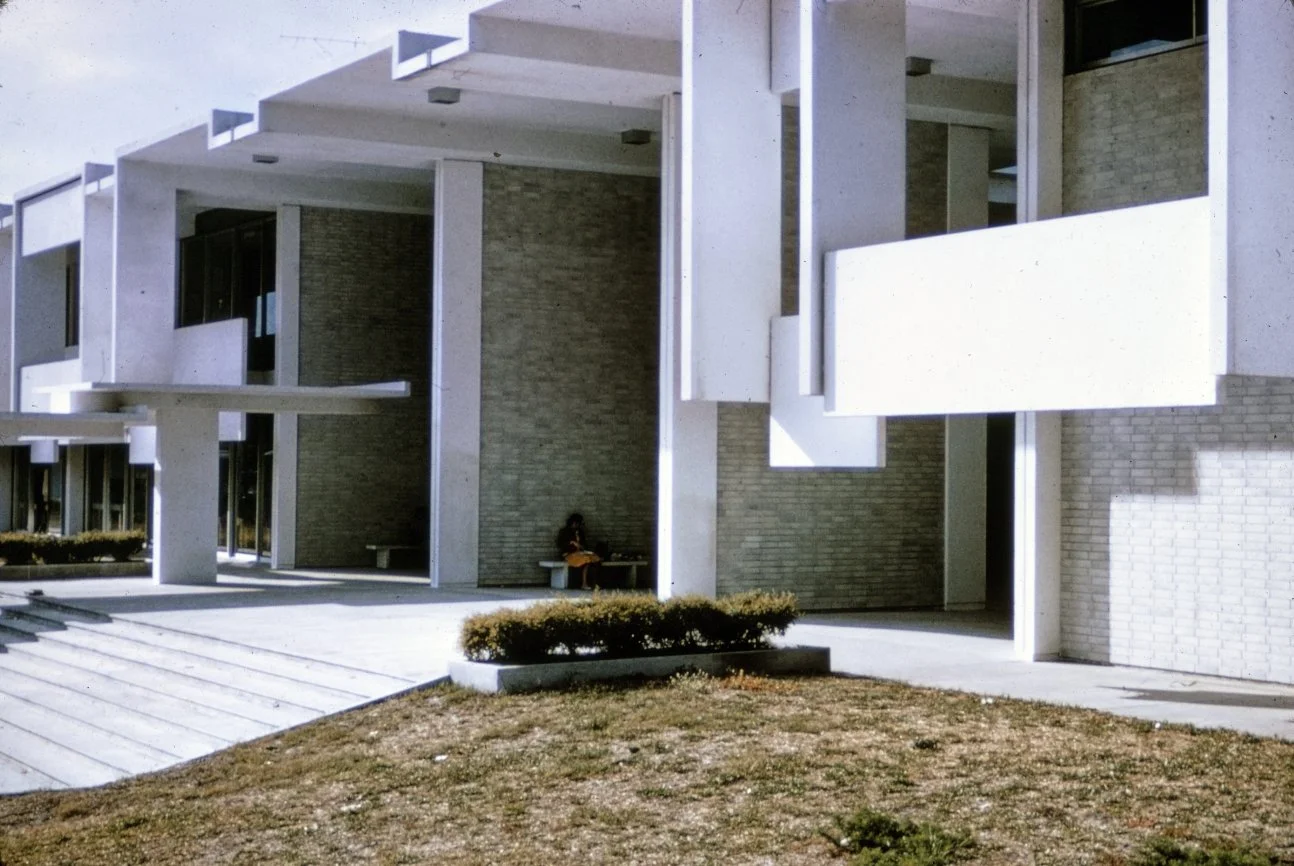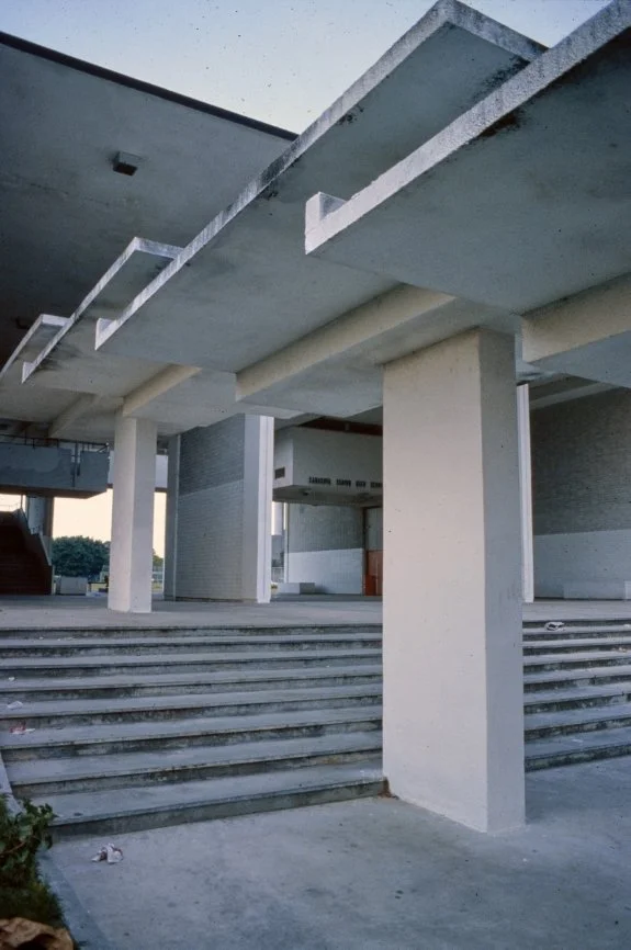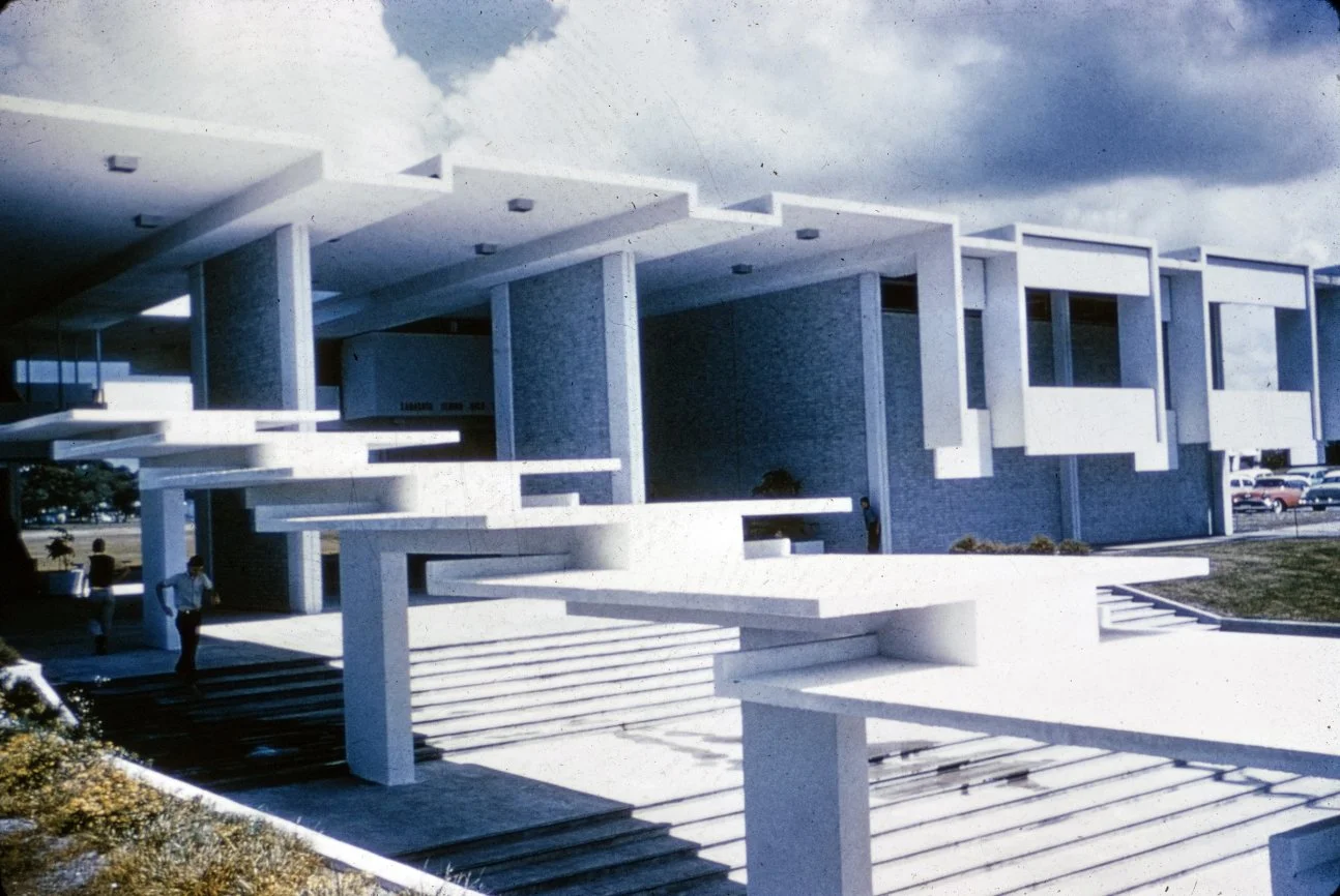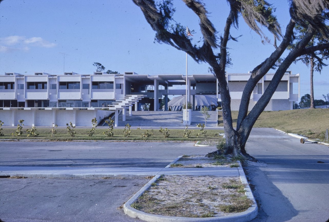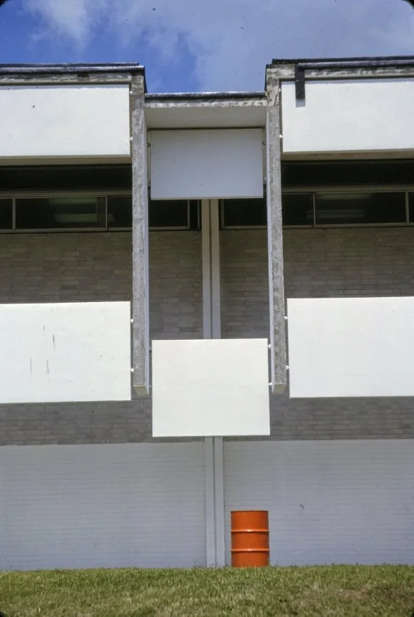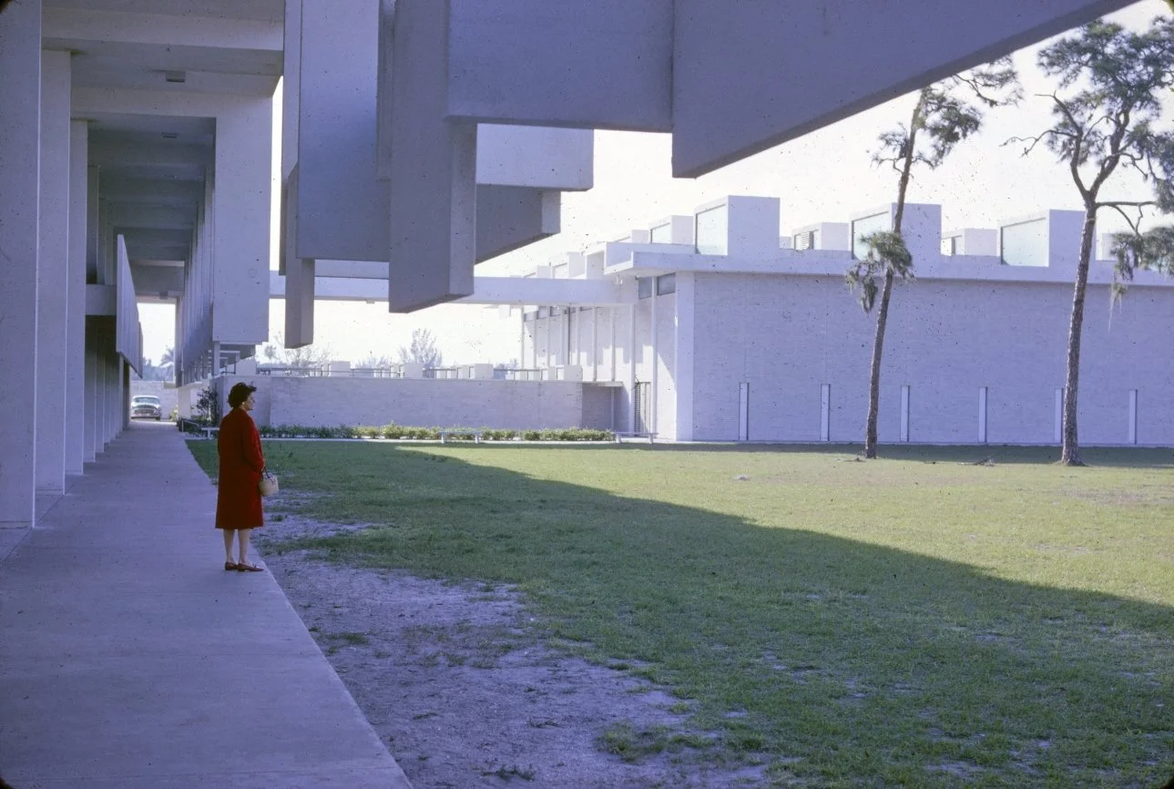 “This building is intended to suggest the uniqueness of the Florida climate through carefully arranged sun shields and interior ventilating and lighting scopes. Its concrete structural frame is bent in such a way as to create hollow boxes at every bay, thereby accommodating an integral mechanical system. Planes in space which allow the building to be understood from great distances are utilized rather than the linear organizations of earlier buildings. The open-ended aspect of the building allows it to grow: thuse the notion that no building is ever fixed and complete within itself is made clear. ”