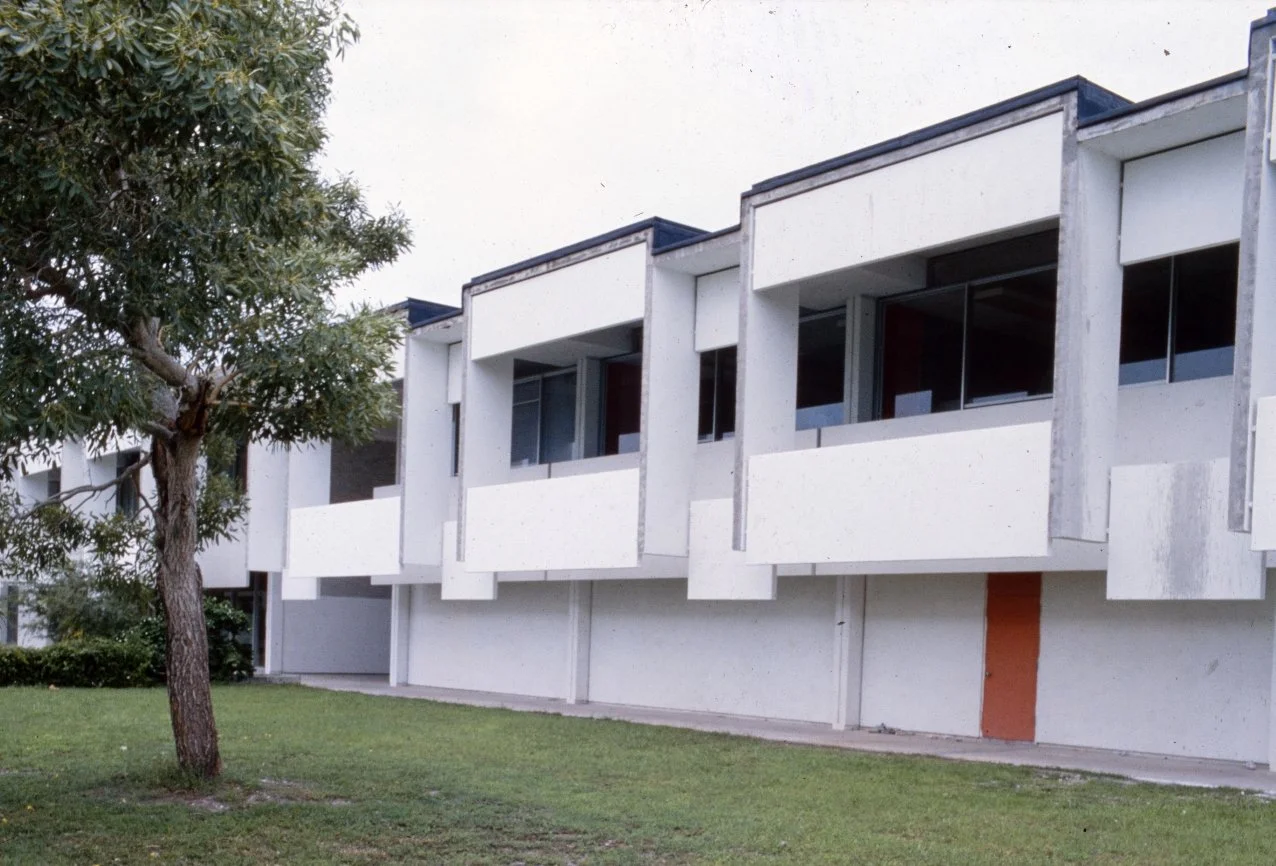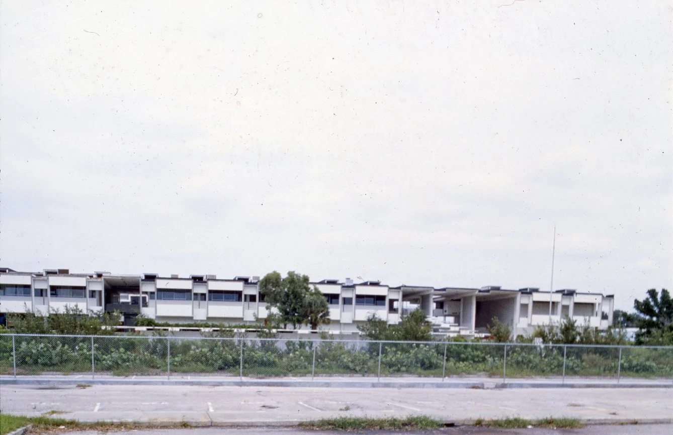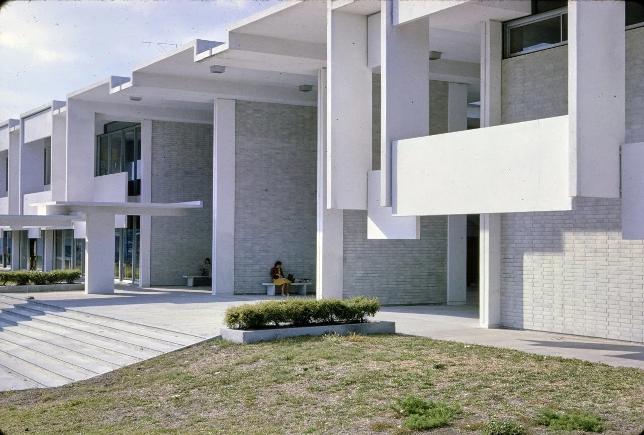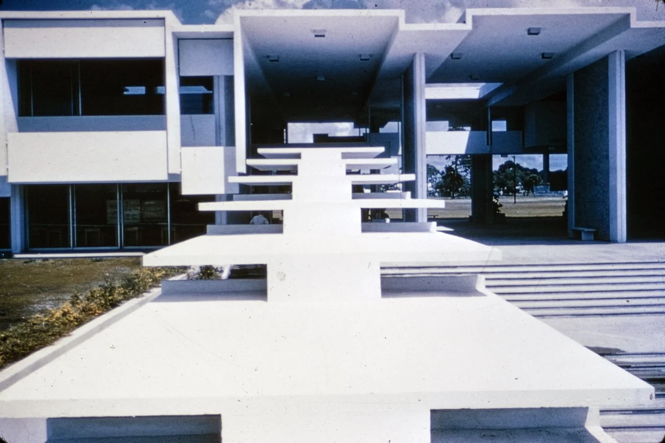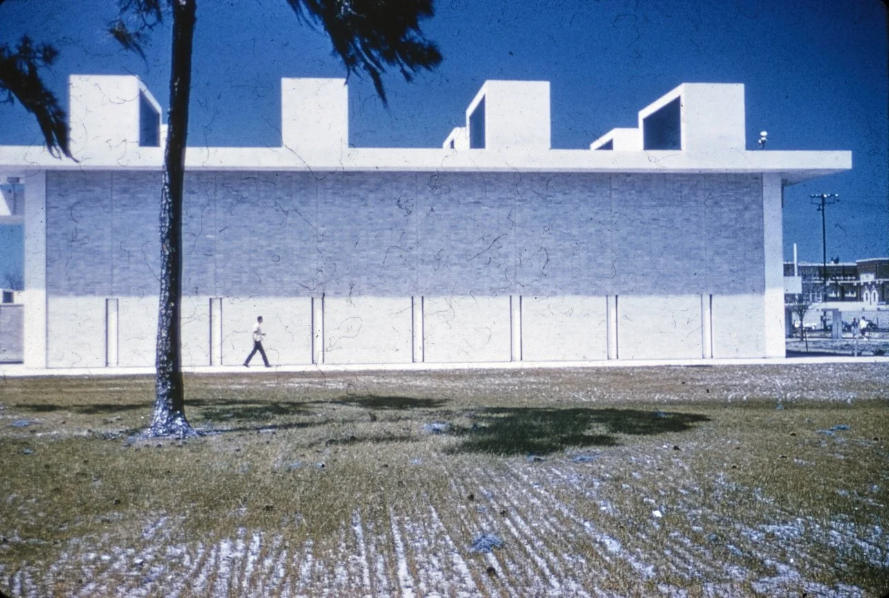 “This building is intended to suggest the uniqueness of the Florida climate through carefully arranged sun shields and interior ventilating and lighting scopes. Its concrete structural frame is bent in such a way as to create hollow boxes at every bay, thereby accommodating an integral mechanical system. Planes in space which allow the building to be understood from great distances are utilized rather than the linear organizations of earlier buildings. The open-ended aspect of the building allows it to grow: thuse the notion that no building is ever fixed and complete within itself is made clear. ”