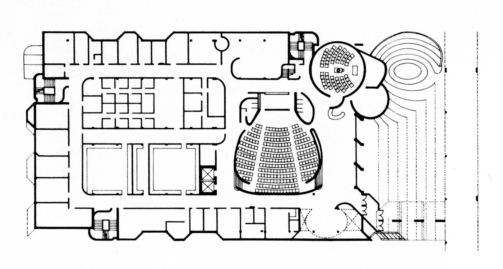 For the core of the arts-oriented college, master planning architect Edward Larrabee Barnes allotted building lots to six well known firms (one of them his own) and let them meet the client's needs in their characteristic ways. A few simple, but strict, ground-rules were laid down covering issues such as access and exterior materials, but there was no effort to impose harmony, except in color and texture, among the closely spaced buildings. Informal coordination was allowed; each architect traded drawings with the architects next door. The resulting campus features buildings designed by Edward Larabee Barnes, Philip Johnson & John Burgee, Venturi & Rauch, Paul Rudolph, Gunnar Birkerts & Associates and the Architects Collaborative.