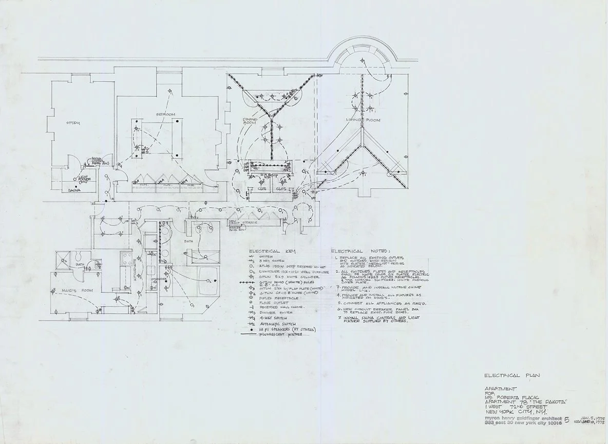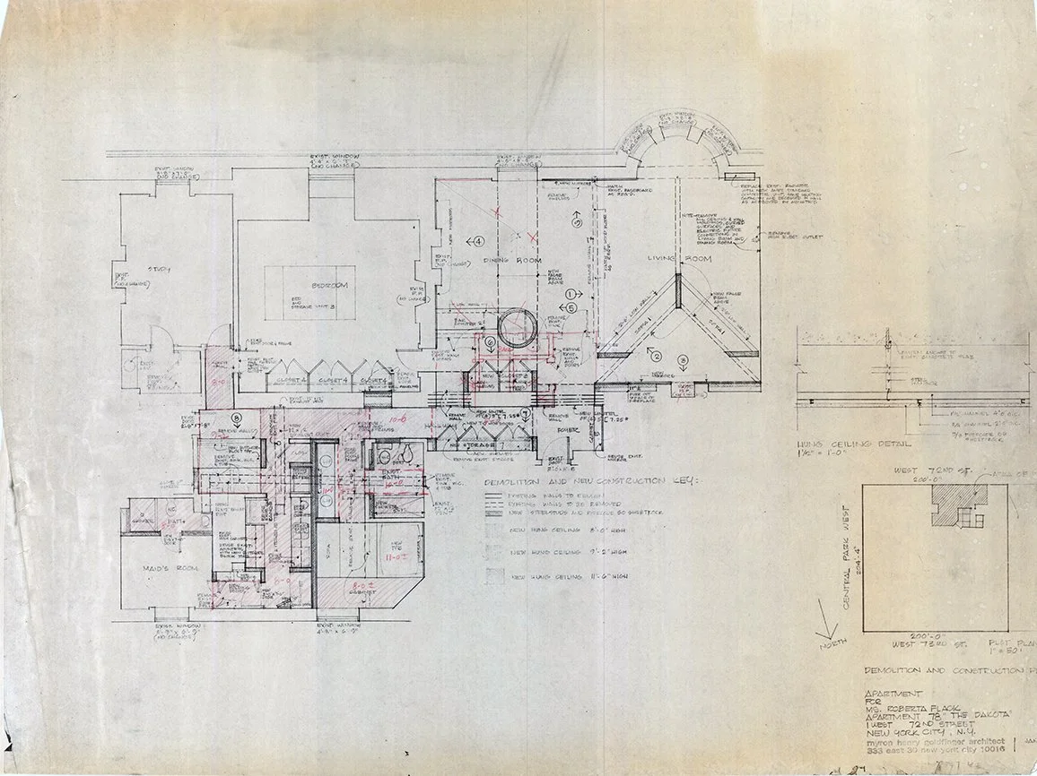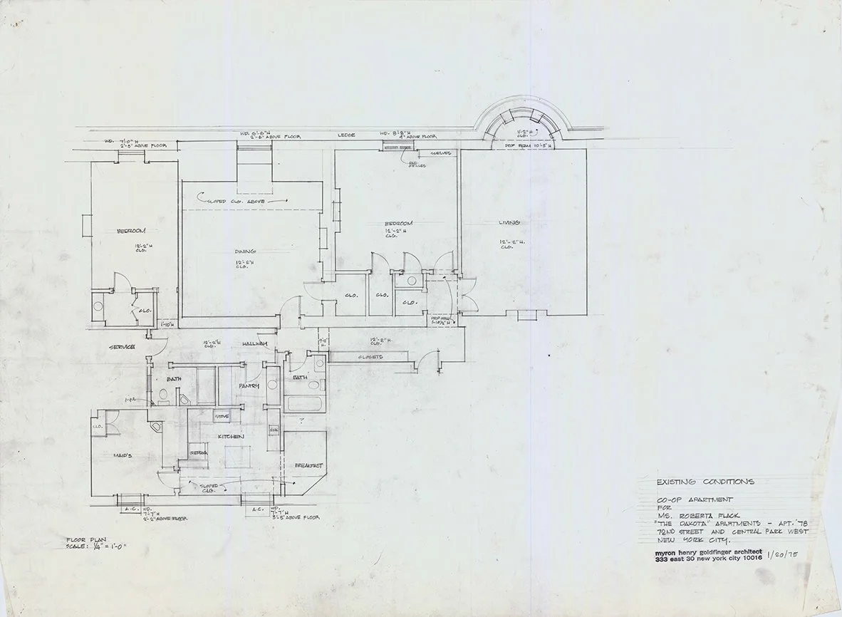 The project consists of the interior renovation of unit #78 for Roberta Flack (1937-2025) in the Dakota building. The Dakota, also known as the Dakota Apartments, is a cooperative apartment building built in 1884 at 1 West 72nd Street on the Upper West Side of Manhattan in New York City, United States. Roberta Flack is a four-time Grammy Award winning singer.