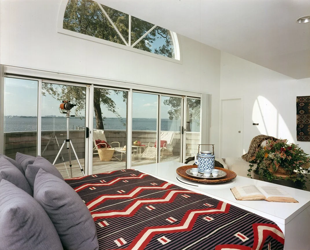 Merge accessory buildings with main house to form a linear waterfront residence with all rooms facing water views. Duplex master bedroom and study suite with roof terrace was built into a triangular tower atop the existing first floor, which offers dramatic views on upper levels.