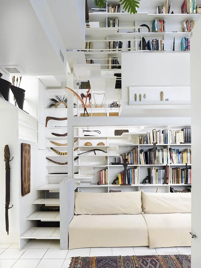 Stair treads become bookshelves in the duplex’s main living area. Photo: Annie Schlechter
