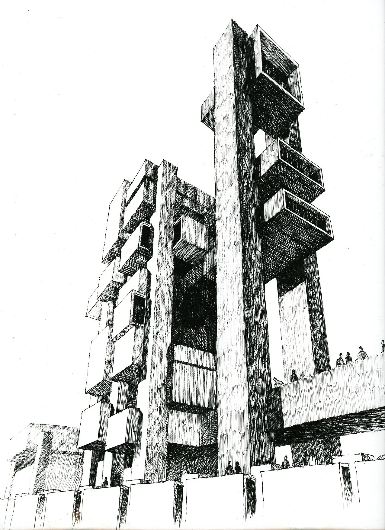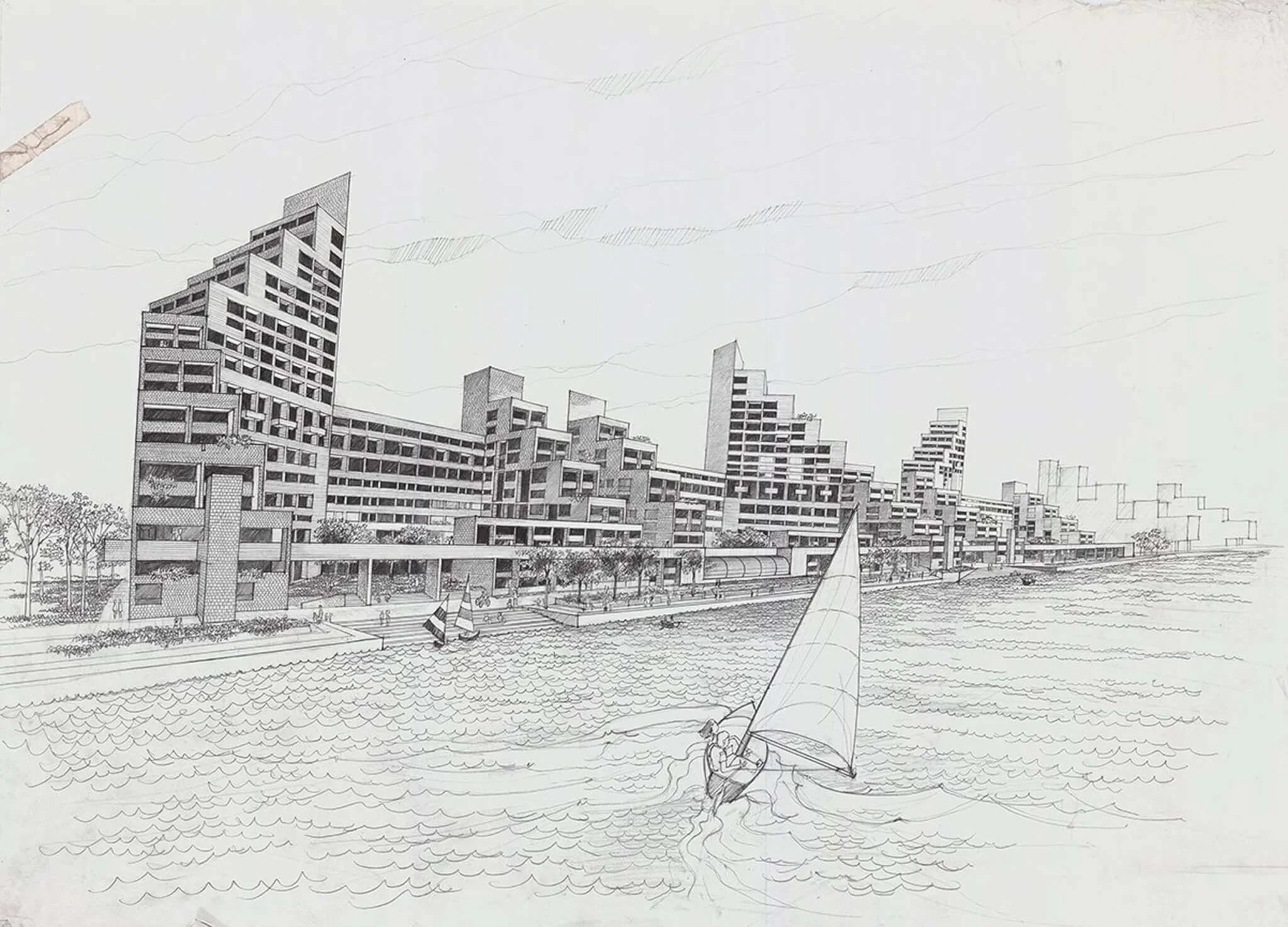 Drawing of the Roosevelt Island Housing Proposal, an unbuilt project designed by Myron Goldfinger in 1975.