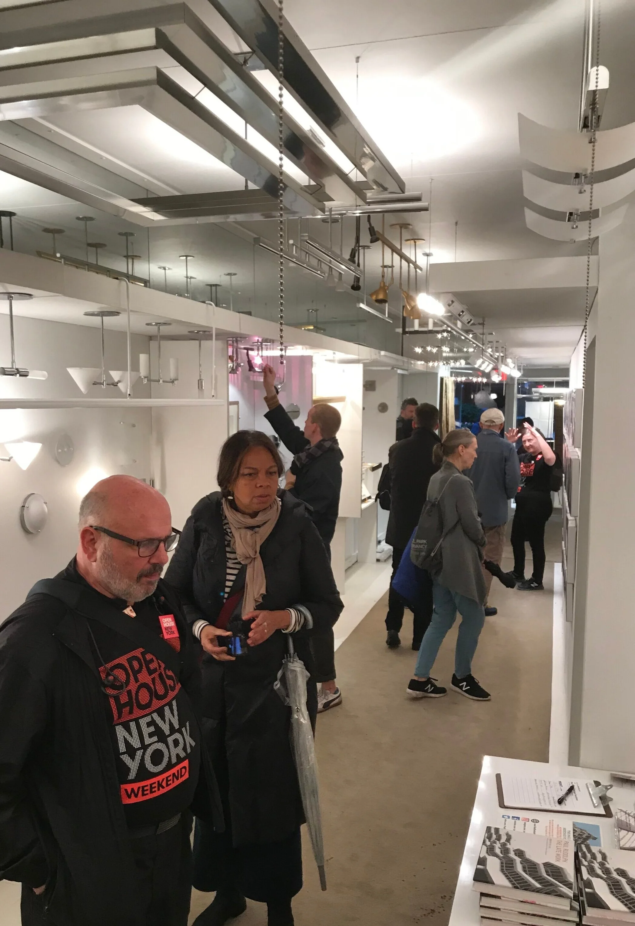 OHNY visitors entered through the building’s street-level MODULIGHTOR showroom—a space designed by Paul Rudolph. The architect was obsessed by light—natural and artificial—and co-founded the Modulightor Company to create fixtures which gave designers more flexible options. The triple-tier chandelier (at the upper-left in this view) is an example of an original Rudolph design.