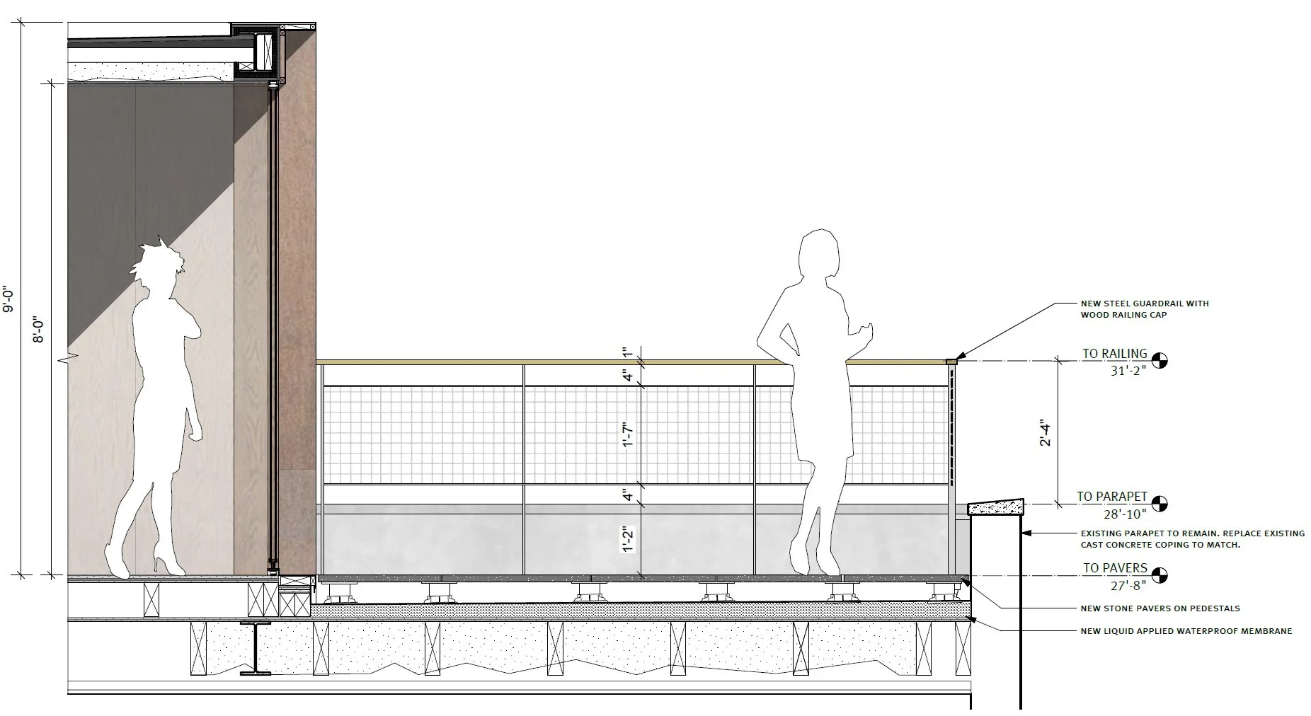 2. The materials of the proposed addition - weathered steel with a galvanized steel guardrail infilled with a galvanized steel grid mesh - are not in keeping with the materials of the existing façade. These elements, especially the galvanized steel guardrail, will be mounted directly against the parapet on State Street and visible from the street. The Merz’s use of wood and concrete block echo Louis Kahn’s sensitive use of materials at the Esherick House which is missing from the design of the proposed addition.