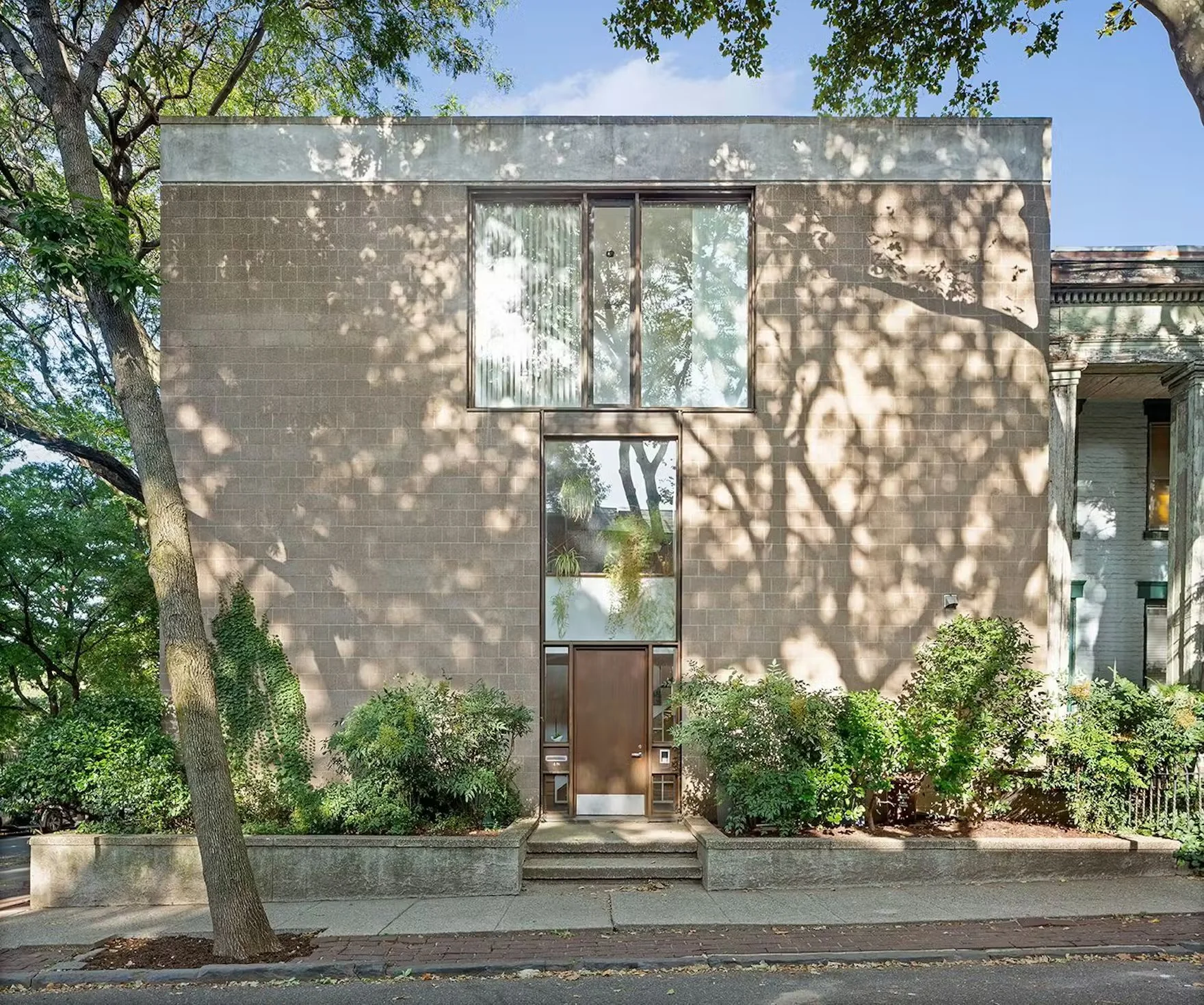 “The Merz house stands out amidst its historic surroundings, a cement block home with more than a nodding resemblance to Louis Kahn’s Esherick House. It’s a modern home defined by a keyhole window overlooking a street that dates back to the age of barrel keys and candlesticks, with its neighbors including colonnaded Greek Revival row houses, brick carriage houses, and a few Gothic revival homes (and the two other Merz units, defined by different simple fenestration). …