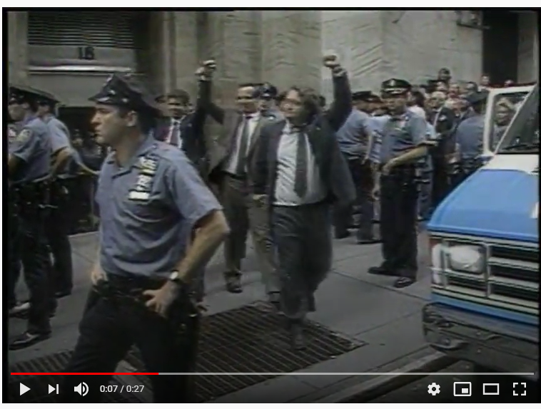 And we had a member of ACT UP who actually worked as a trader on the New York Stock Exchange who was able to tell us how lax the security actually was. And there was this door that you could use to get into the Stock Exchange, one of the, there are various doors you could go through. But one of them is right under the columns that you see of the famous picture of the Stock Exchange. So, it faces Broad Street, where the columns are and right behind those columns is that big floor you see on the news. So, that door is literally, you go into it and then there’s three steps to your left, a little landing and another three steps up and you’re on that floor. It’s that close to the street. And there’s no traffic on that street anymore ’cause a bomb would really do a job on the New York Stock Exchange just from the street. So, and there was just one security guard there with no metal detectors. That’s all there was for the entire Stock Exchange.
