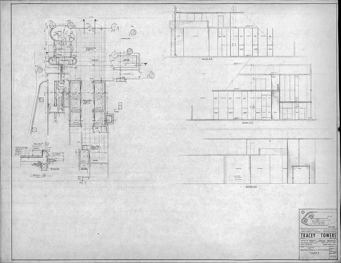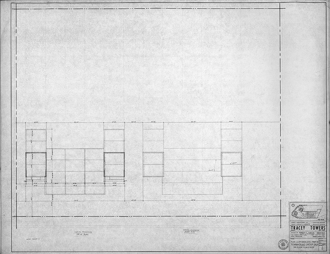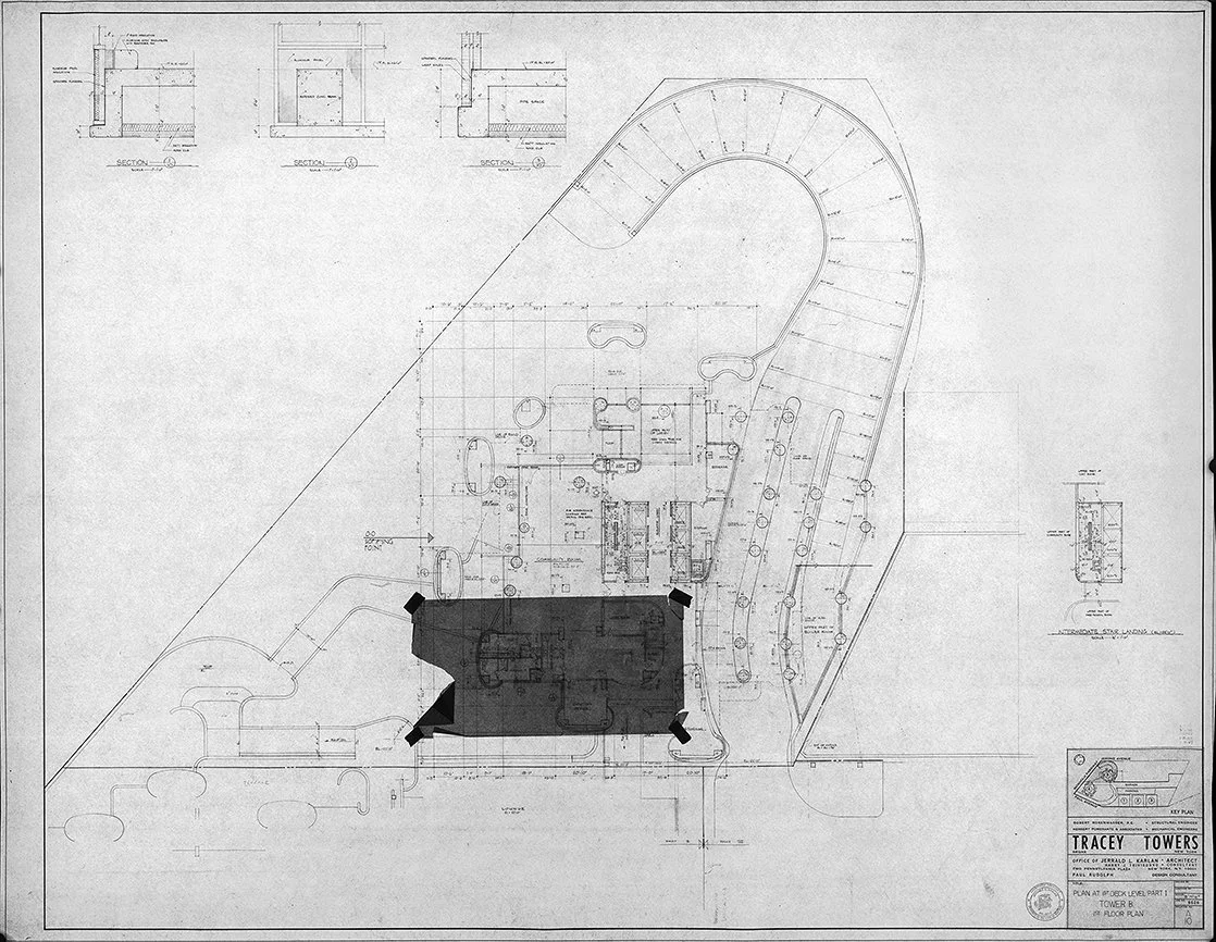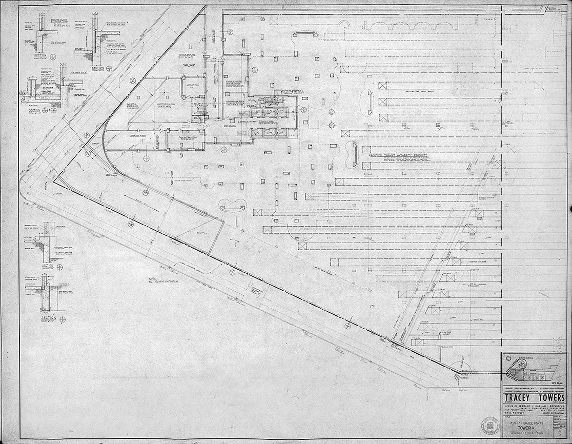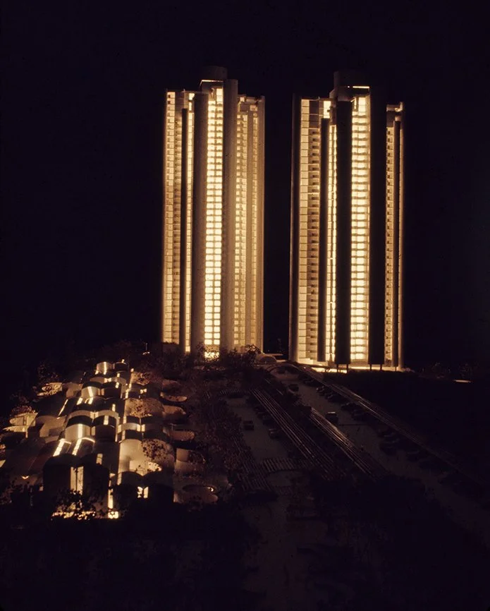 ““Tracey Towers utilizes the air rights over a storage yard for subway trains, simultaneously eliminating a Twentieth Century eyesore and creating a man-made plateau within the New York City area which gives a sense of community and identity. One tower is over the tracks, the other one on virgin territory, placing the entrances to the two towers at different elevations. The platform is used for parking, townhouses, recreational facilities and the contemporary phenomenon of a garden with air space under it. The form of the towers derives from the varied sizes of the apartment units and the curvilinear forms dictated by the site and automobile movement.””